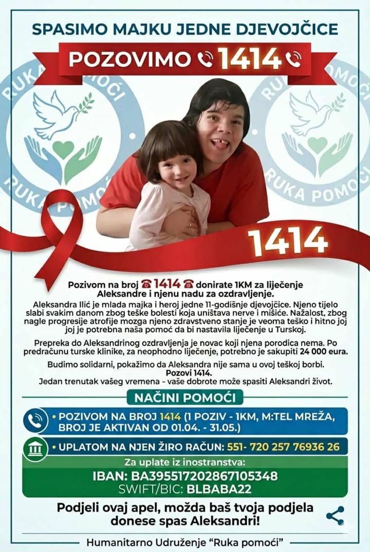 Pozivom na broj 1414 donirate 1KM za liječenje Aleksandre Ilić koja se nalazi u veoma teškom zdravstvenom stanju.