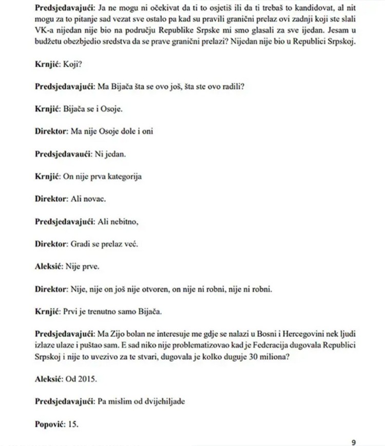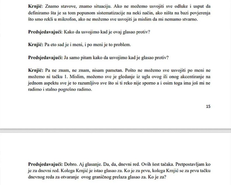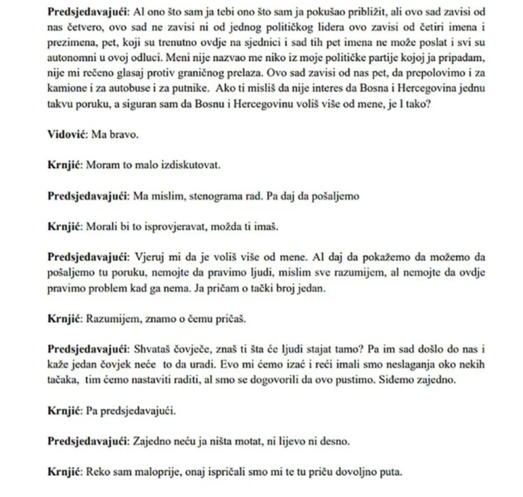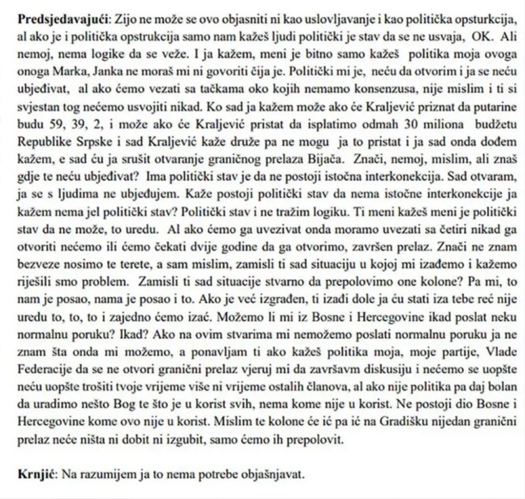 U stenogramu sa pomenute sjednice jasno se vidi da je Krnjić itekako svjestan da je otvaranje graničnog prelaza od izuzetne važnosti za cijelu BiH, ali ipak se odlučio za uslovljavanje.